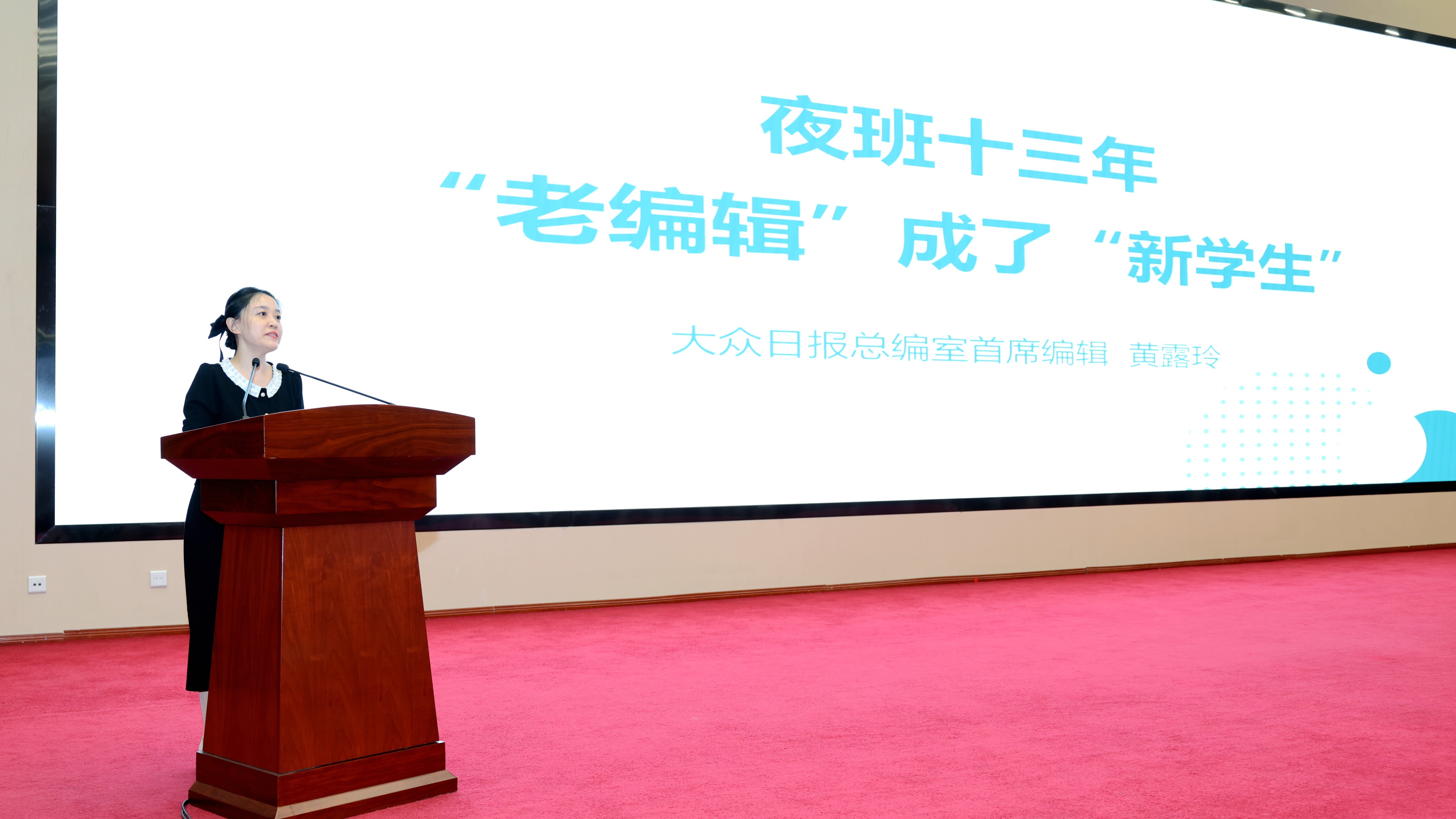 随后进行的故事分享会环节,9位来自不同岗位的新闻工作者,分享了各自扎根一线、践行使命的职业感悟。大众日报总编室首席编辑黄露玲以《夜班十三年,“老编辑”成了“新学生”》为题,道出传统媒体人在融合转型中的坚守与成长;大众新媒体大平台视觉中心视频工作室主任马海燕重温《我们在九三阅兵现场》的场景,让人感受到重大事件中记者那份沉甸甸的责任与荣光;大众新媒体大平台传媒中心编辑刘宪伟以《从0到471,一张开屏何以“让世界看见美好”》,讲述新媒体人如何以创新传播让凡人微光汇聚成星河;大众国际传播中心记者毕淑雅回忆《一次跨越太平洋的连线,对方记住了Dazhong Daily》,诉说着山东媒体走向世界的坚定步伐;农村大众报记者衣春悦在《紧随时代 贴地生长》中,分享了青年三农记者的实战清单与进阶攻略;齐鲁晚报·齐鲁壹点技术中心副主任刘鹏借《代码亦笔锋:一名技术人的新闻初心》,展现技术赋能新闻的活力;网媒集团新青年公司副总经理王云晓通过《在场:我们的故事,我们的时代》,彰显了青年记者拥抱时代的担当;半岛都市报舆情中心首席舆情分析师宫岩岩以《脚步告诉我答案》,生动印证了新闻人的理想和坚守;鲁中晨报编辑制作中心副主任郝玲以《与时代同“屏”》,道出媒体人在传播变革中与时代共振的追求。一个个鲜活的故事,串联起新闻工作者的日常,台下不时响起的掌声,是共鸣,是致敬,更是同行者之间无言的默契。